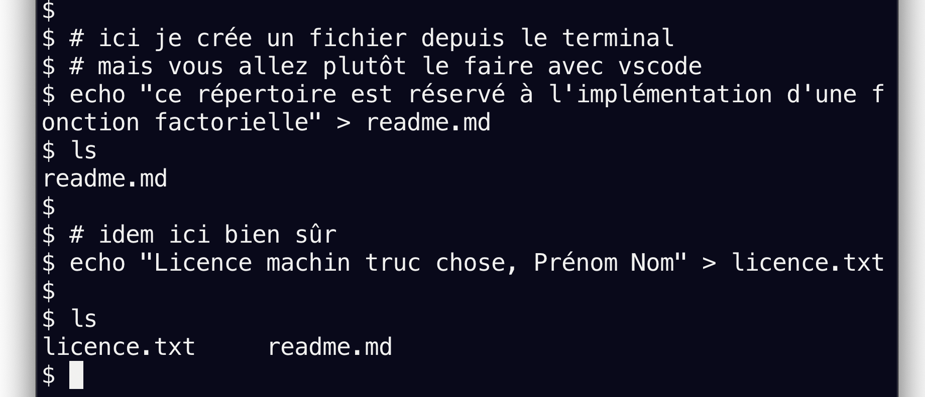 echo "ce répertoire est réservé à l'implémentation d'une fonction factorielle" > readme.mdIl est important aussi de définir un fichier de licence afin d’expliquer les droits des personnes qui utiliseront un jour votre code. Nous ne nous appesantissons pas là dessus aujourd’hui.
