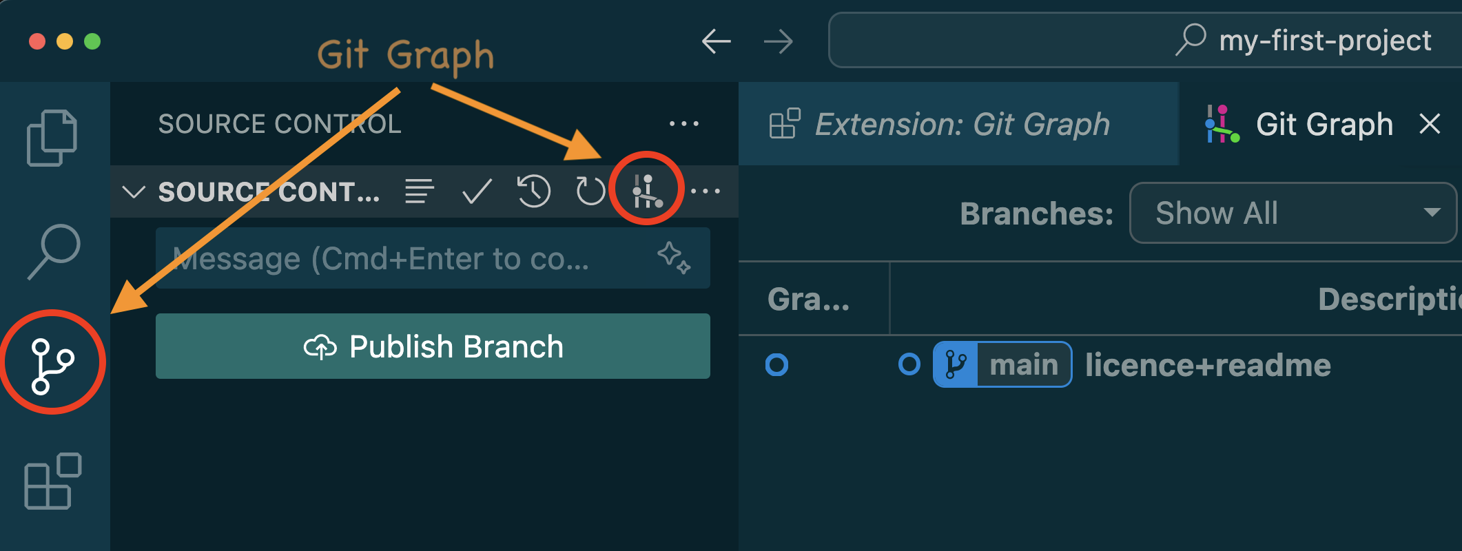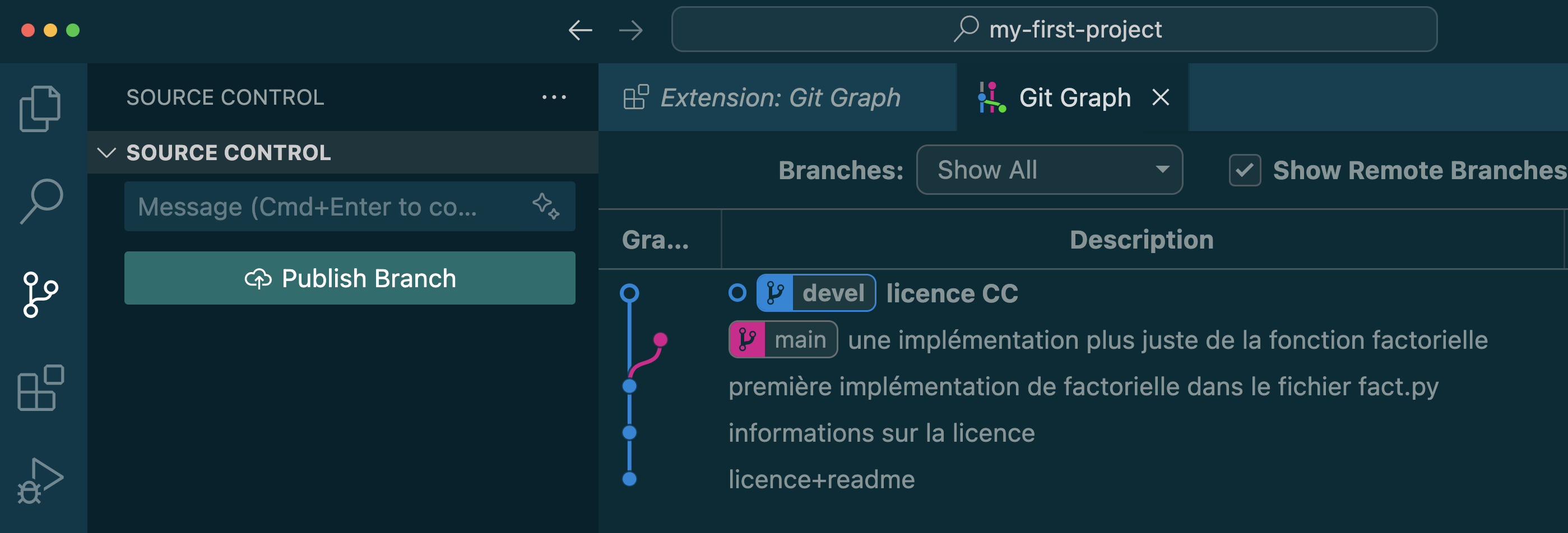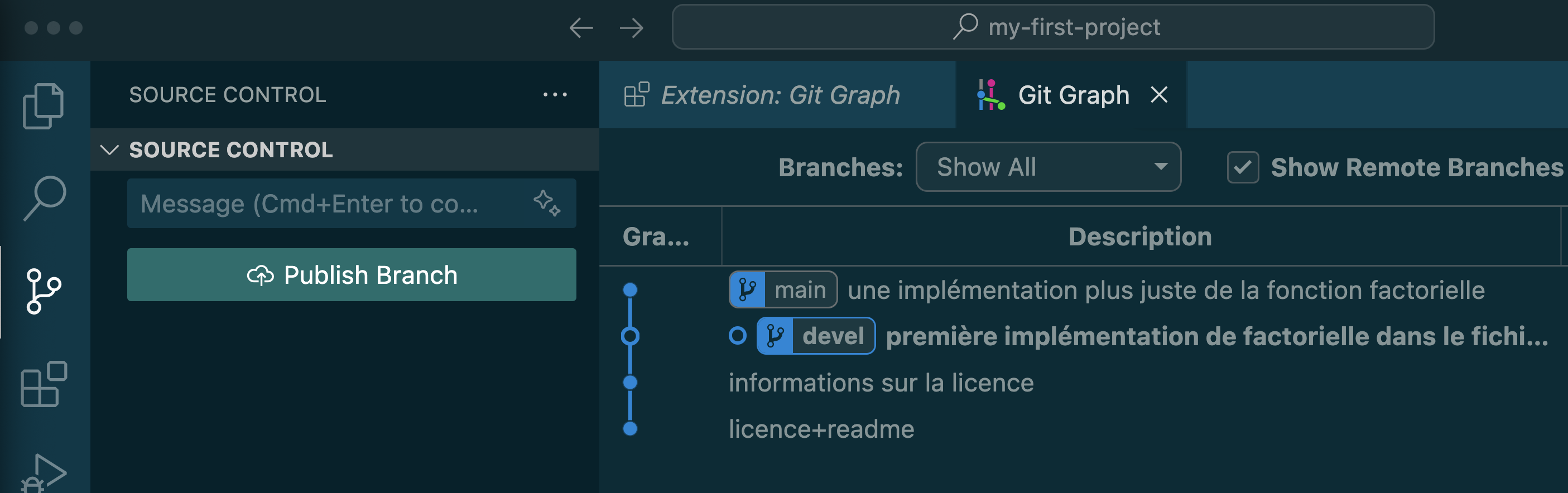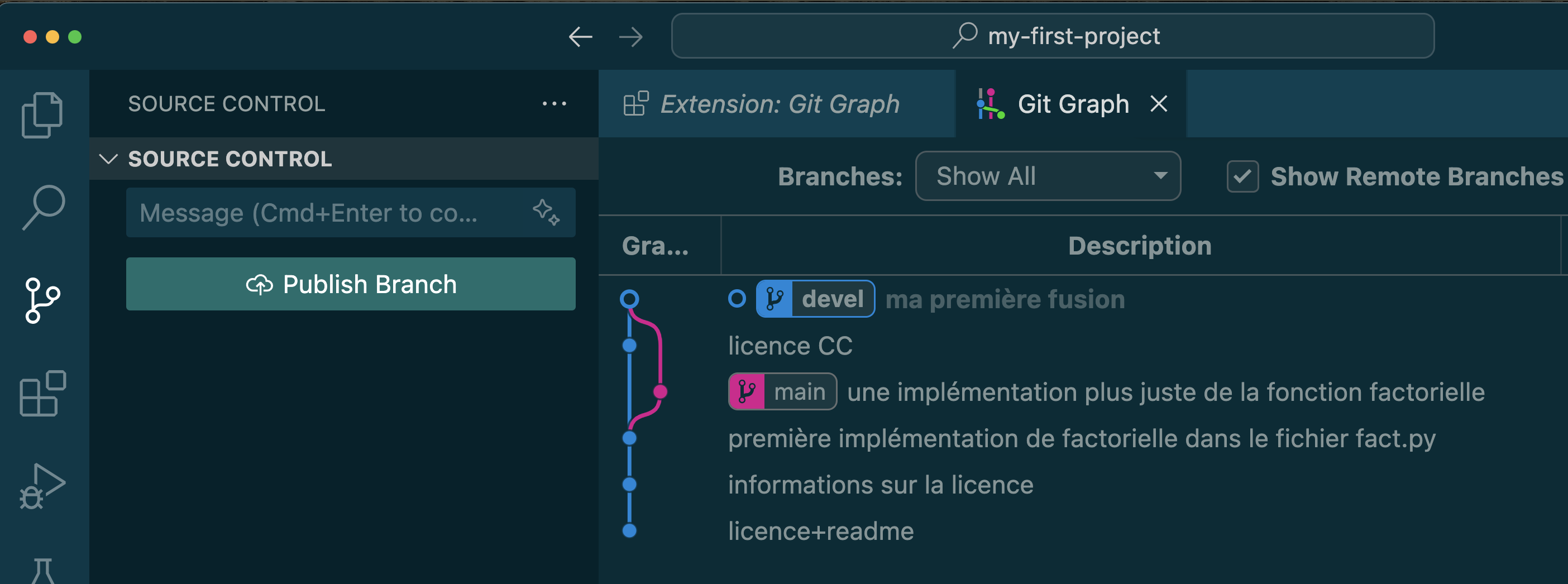 toutefois il y a une extension qui est très utile: cherchez dans les extensions vs-code le mot Git Graph et installez-là si nécessaire
