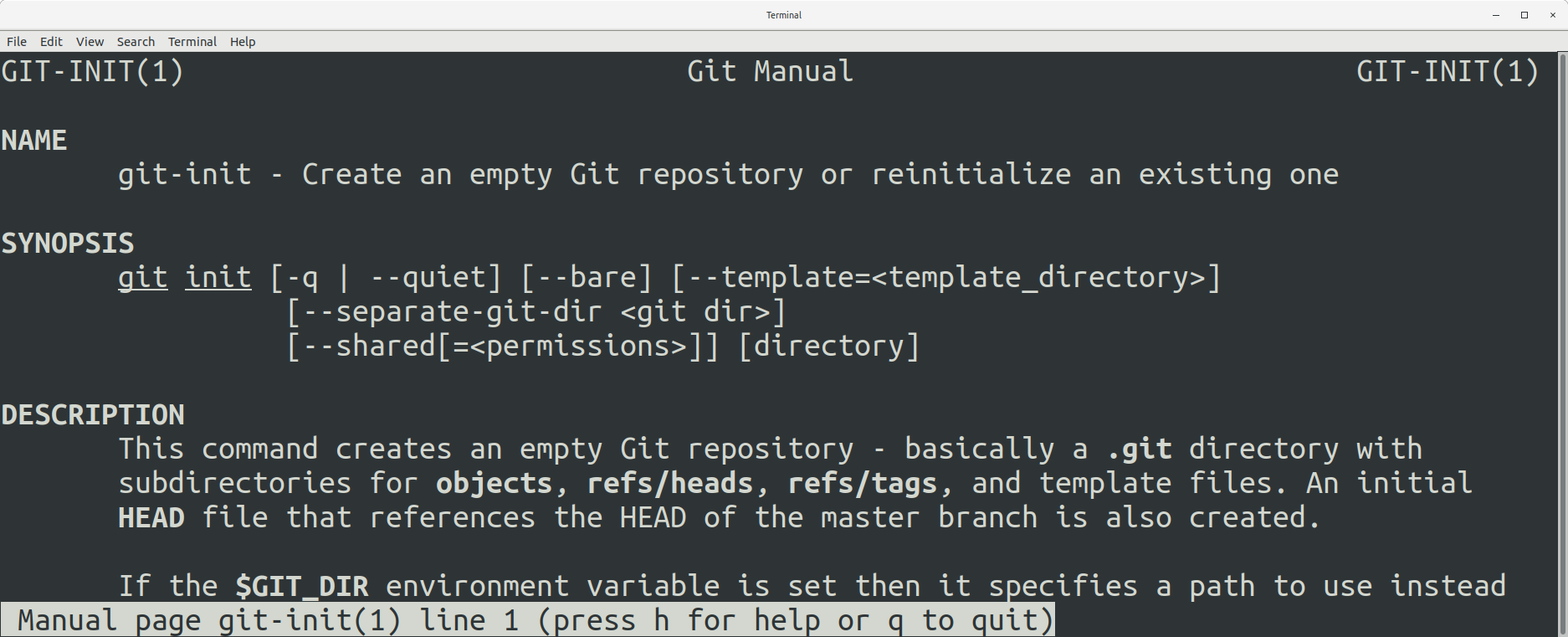 Comme pour toutes les commandes du système, de très nombreuses options sont disponibles, à consulter dans la documentation; vous pouvez par exemple faire pour cela git init --help
