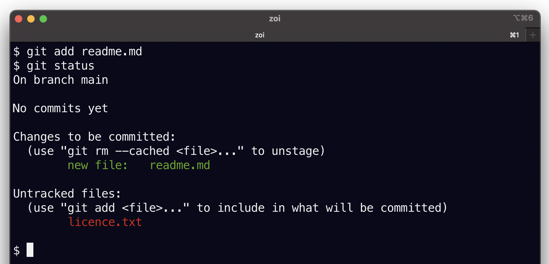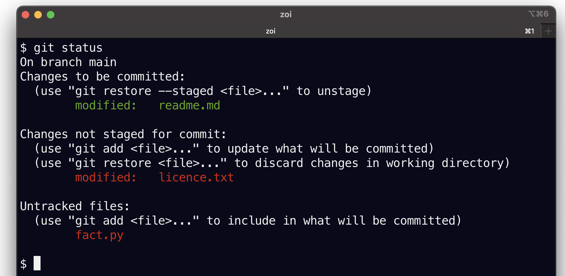 et après cela vous pouvez taper juste `git s` comme un raccourci de `git status`Ce message vous dit plusieurs choses que nous allons détailler.