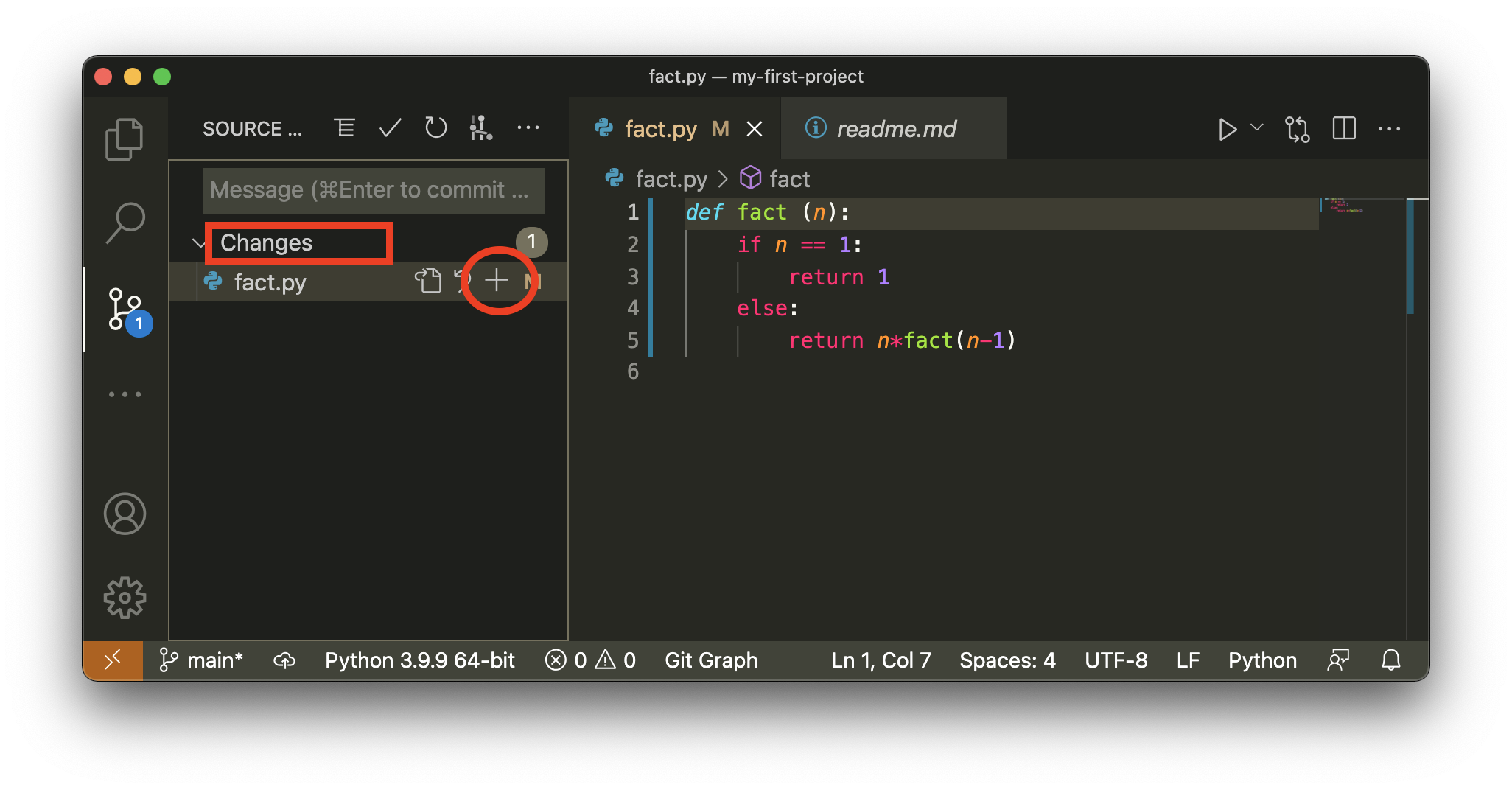 On va donc créer un fichier readme.md; notons qu’on va le faire dans ce notebook, de manière super simple en redirigeant un petit morceau de texte dans un fichier de nom readme.md. Mais vous pouvez aussi ouvrir vs-code et y éditer vos fichiers (attention à bien les mettre dans le répertoire my-first-project !)