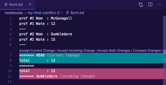 pour résoudre le conflit, on doit utiliser un éditeur de code; dans vs-code par exemple on verrait ceci