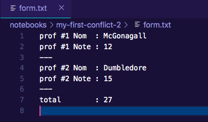 cat form.txt prof #1 Nom : McGonagall prof #1 Note : 12 ‒‒‒ prof #2 Nom : Dumbledore prof #2 Note : 15 ‒‒‒ total : 27